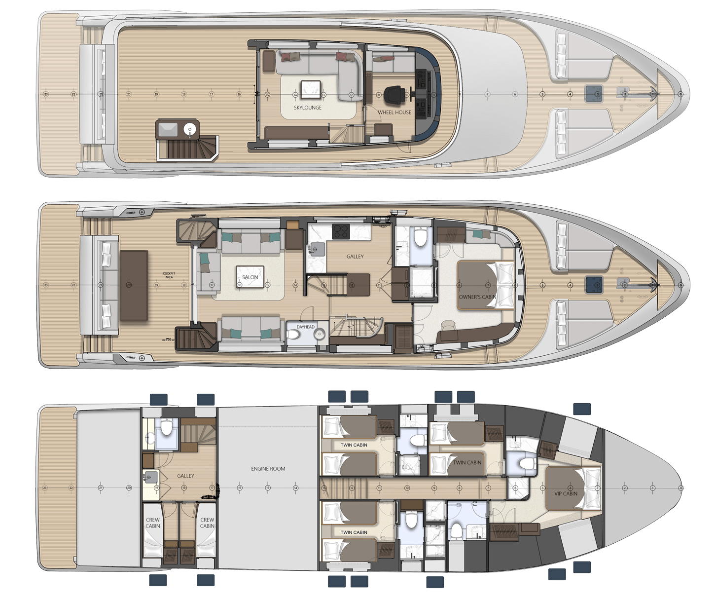 The Nomad 75 delivers both an open fly-bridge version or fully enclosed upper deck and creates a feeling of space and comfort beyond the category specification.