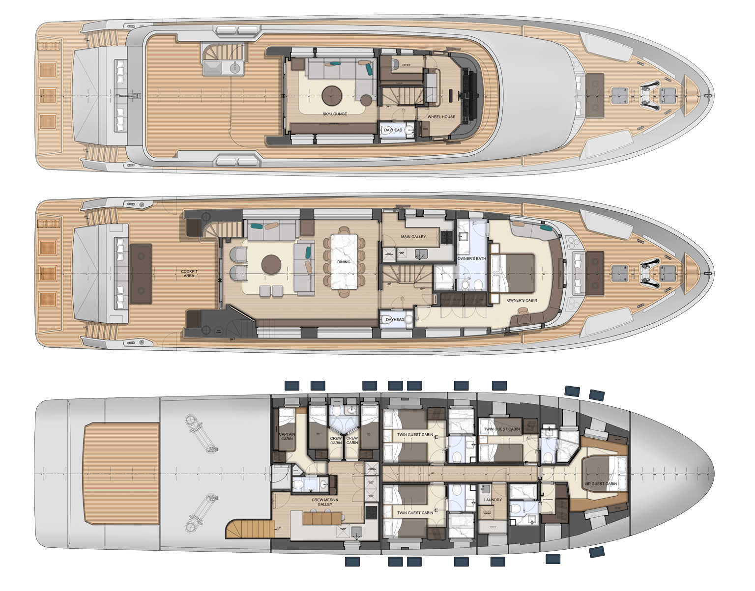 The NOMAD 95, delivers similar performance characteristics to her slightly larger sister in the fleet, but also provides flexibility in her two layout options, where the owner’s cabin can be located on the main deck, perfect for an owner / operator approach.